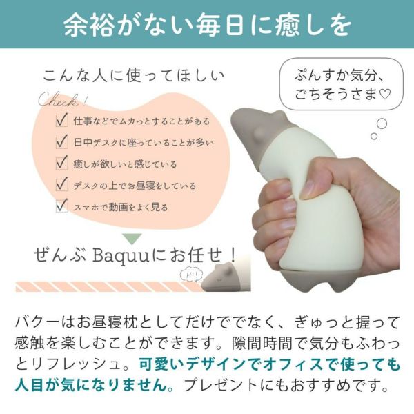 Baquu( バクー)は デスクの上で使える かわいい オフィス枕 として人気のお昼寝枕。コンパクトで軽量、ぷにぷにとした ポリウレタン と シリコンが絶妙な触り心地を生み出し、ツボ押しや握って気分転換、リストレスト、スマホスタンドとしても活躍します。仮眠枕 としても使える多機能 クッション は、デスクワーク中の癒しグッズ にちょうどよく、ギフトにも喜ばれる、お疲れなあなたを サポート する 携帯枕 です。
