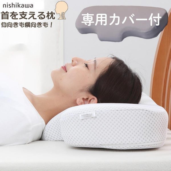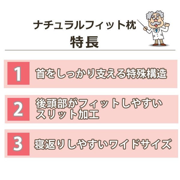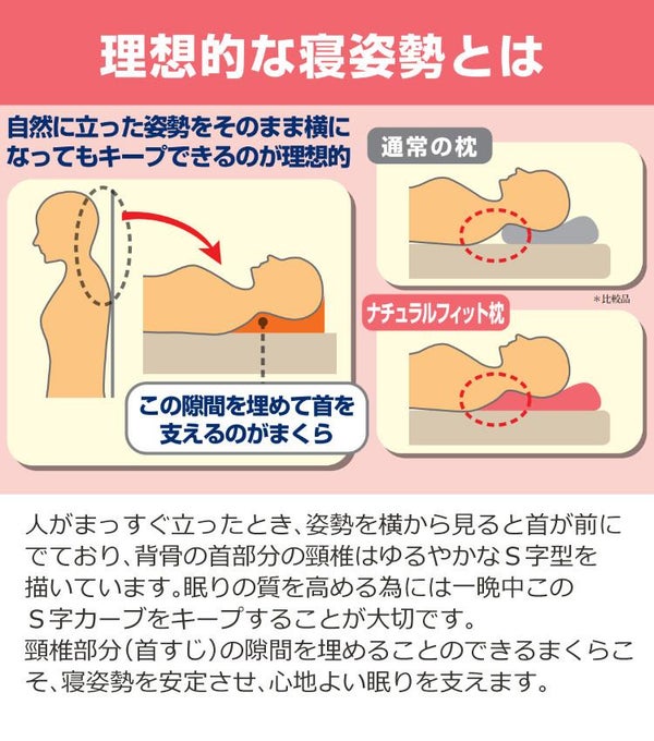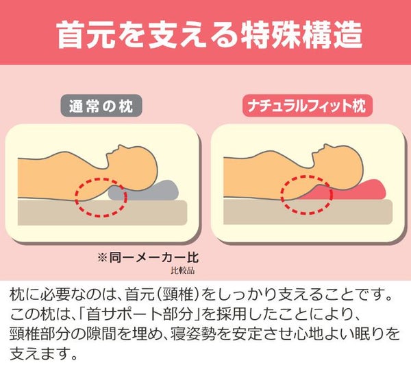 首をしっかり支えてくれる、ナチュラルフィット枕です。首サポート部分で首の隙間を埋め、ラクに寝られる構造に。横向き寝の際は、肩がはまるような形状で、ワイドサイズで寝返りも打ちやすくしています