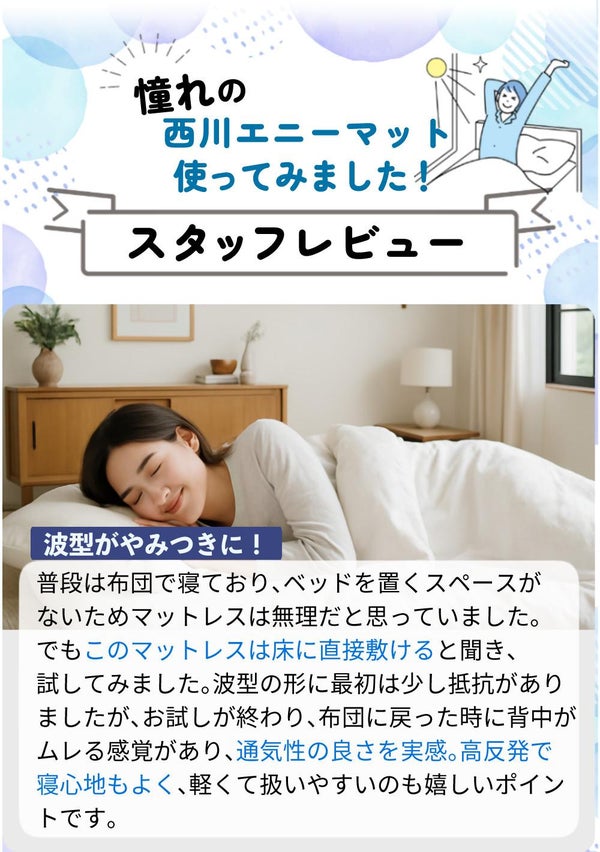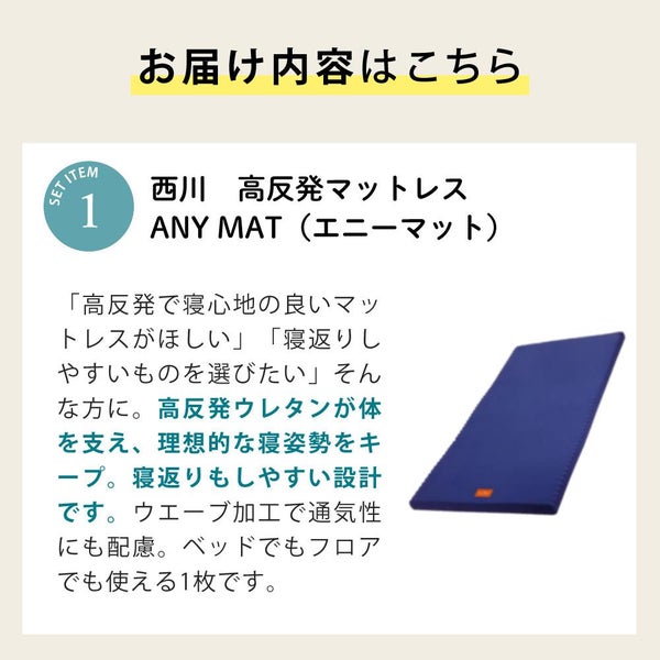 高反発ウレタンで体をしっかり支え、寝返りラクラク、快適な寝心地をお届けする「ANY MAT(エニーマット)」。