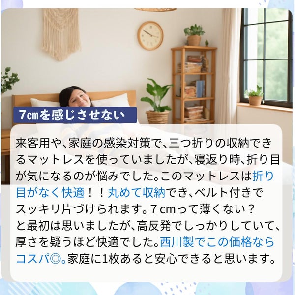 人気の Nishikawa の 高反発 マットレス 「 エニーマット JC02009414230 」は、 軽量 で 折りたたみ 可能、 コンパクト に収納できるため 布団から買い替え を考える方 や 一人暮らし の方に最適です。 側生地の 表地・マチ には ニット生地、 裏地 に メッシュ 生地 を採用し 通気性 に優れ、 洗える 側生地 と 抗菌加工 で 清潔さも確保。 収納ベルト 付きで 来客用 や プレゼント にもおすすめ。 母の日 父の日 や 快眠 を贈る ギフト にもぴったりの一枚です。