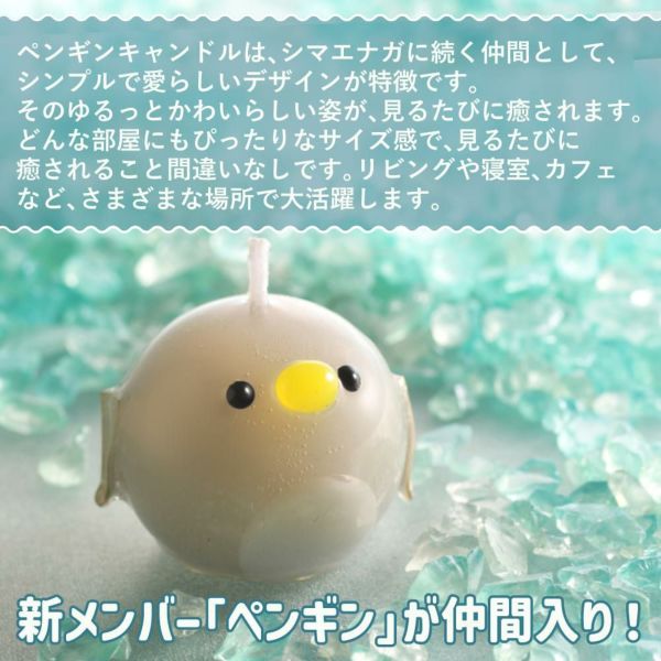 ペンギンキャンドルは、シマエナガに続く仲間として、シンプルで愛らしいデザインが特徴です。そのゆるっと穏やかな姿が、見るたびに癒されます。
