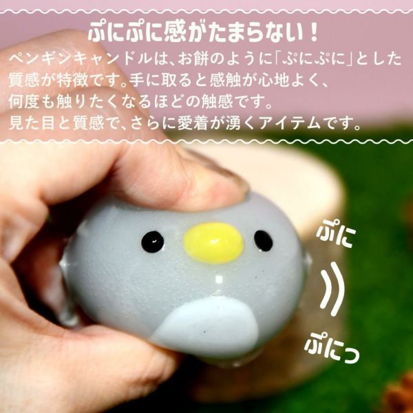 ペンギンキャンドルは、お餅のように「ぷにぷに」とした質感が特徴です。手に取ると感触が心地よく、何度も触りたくなるほどの触感です。