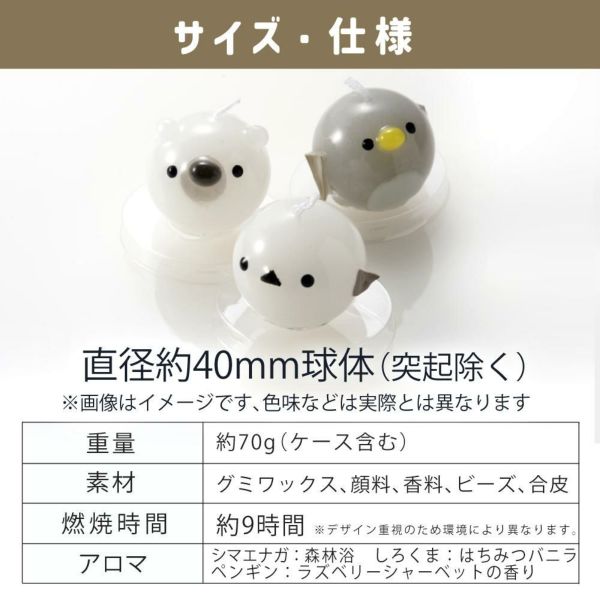 森林浴の香り(シマエナガ)・はちみつバニラの香り(シロクマ)・ラズベリーシャーベットの香り(ペンギン) |