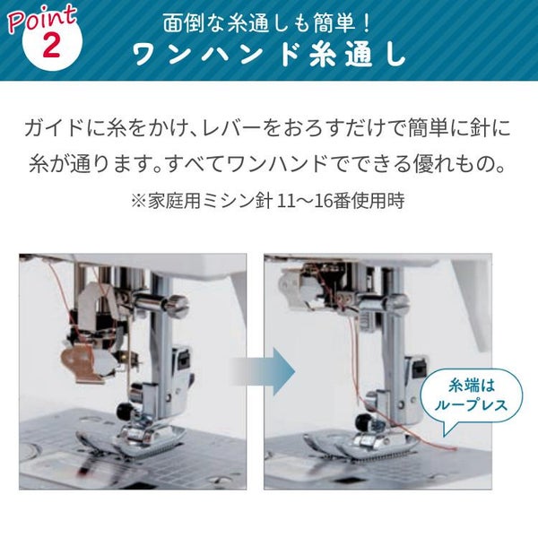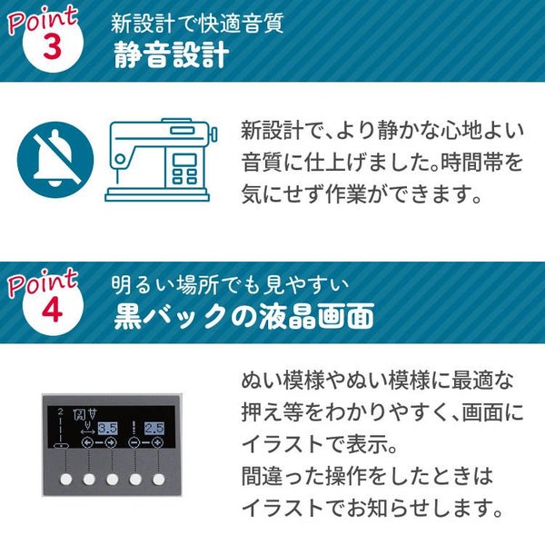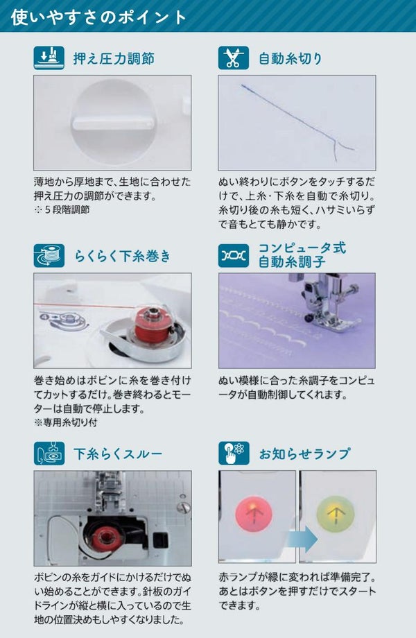 自動糸調子/自動針穴糸通し/ダイレクト模様選択/自動糸切り/らくらく下糸巻き/下糸らくスルー/液晶画面/全自動ボタンホール/ワンタッチスローボタン/水平全回転ガマ/ワイドなソーイングスペース/下糸巻き自動停止/段縫い押えボタン/7枚送り歯/止め縫い/押え圧力調節/LED手元ランプ/静音設計/送り調節/振り幅調節/お知らせランプ/針上下ボタン/糸切れ検知/ドロップフィード/フリーアーム/コードリール/手ぬい風キルトステッチ