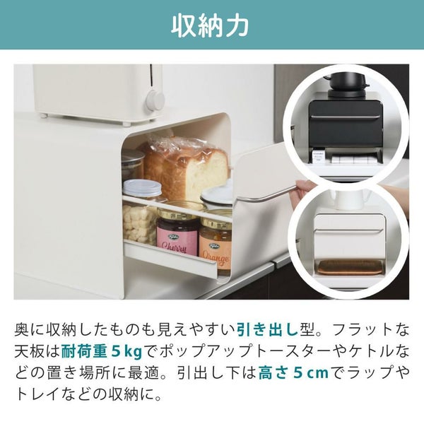 本体上部の天板は耐荷重約5kg。電気ケトルやコーヒーメーカーなど、日常使いの調理家電を置くことができます。キッチンスペースを有効活用し、動線をスムーズにします。