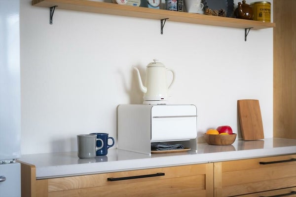 このスリムなブレッドケースは、引き出し型の設計により、食パンを清潔に保ちながら、取り出しやすさも実現。パンケースとしての機能はもちろん、キッチンの省スペース化にも貢献します。