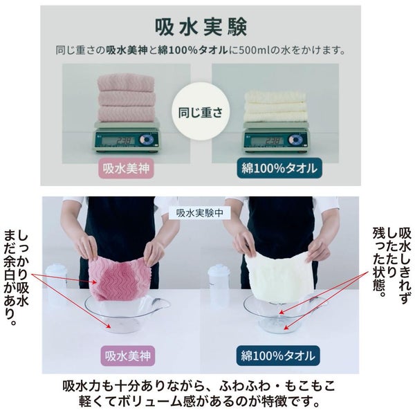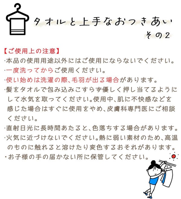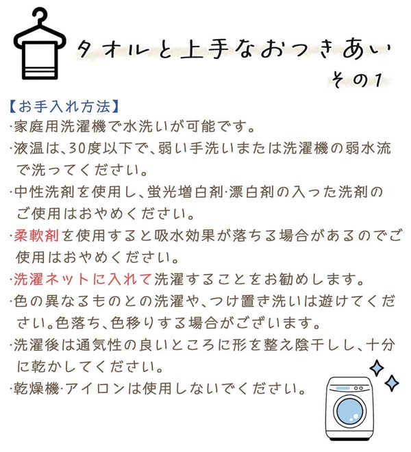 ・柔軟剤を使用すると吸水効果が落ちる場合があるのでご使用はおやめください。