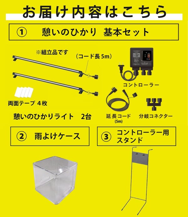 【付属品】憩いのひかり 2台(コード長5m)、 両面テープ 4枚、コントローラー、 延長コード(5m)、分岐コネクター