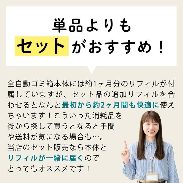 全自動ゴミ箱本体には約1ヶ月分のリフィルが付属していますが、セット品の追加リフィルを合わせるとなんと最初から約2ヶ月間も快適に使えます。消耗品を後から探して買うとなると手間や送料が気になる場合も…。当店のセット販売なら本体とリフィルが一緒に届くのでとってもオススメです!あかちゃんのおむつ、ペットのシーツ、においや衛生面で気になるごみもエルビンにおまかせ。出産のお祝いやプレゼントにもぴったりの商品です。