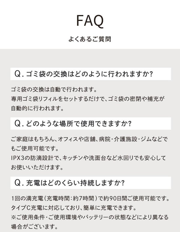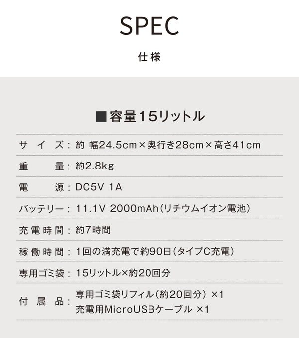 | 専用ゴミ袋 | 15リットル×約20回分 |