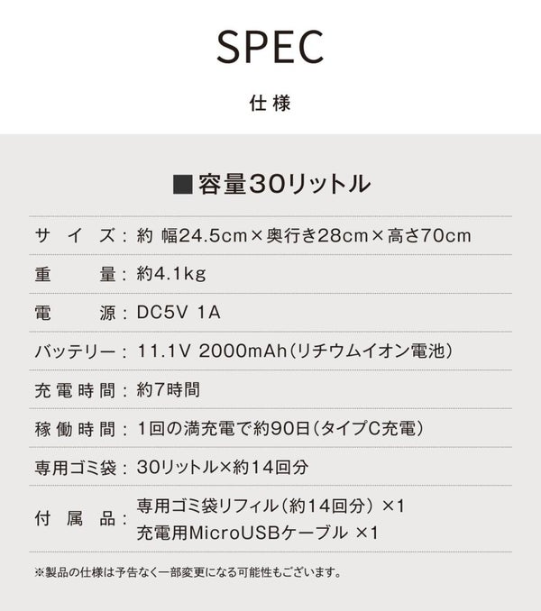 | 専用ゴミ袋 | 30リットル×約14回分 |
