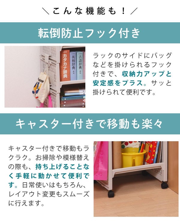 ランドセルラック は 収納ラック として リビング収納 キッチン収納 クローゼット収納 さらには サニタリー収納 まで 活躍 する 多機能ラック です。3段ラック / 4段ラック から 選べる ラック3点セット には バスケット と 小物整理トレー が 付属 し 散らかりがちな ランドセル や 学用品収納 を スッキリ 整理 できます。 バッグ も 掛けられる 転倒防止フック や キャスター付き で 移動簡単、 お片付け が スムーズ で お子さま の 自立サポート に 役立ちます。 ベージュ の PP素材 で 清潔感 ある デザイン です。