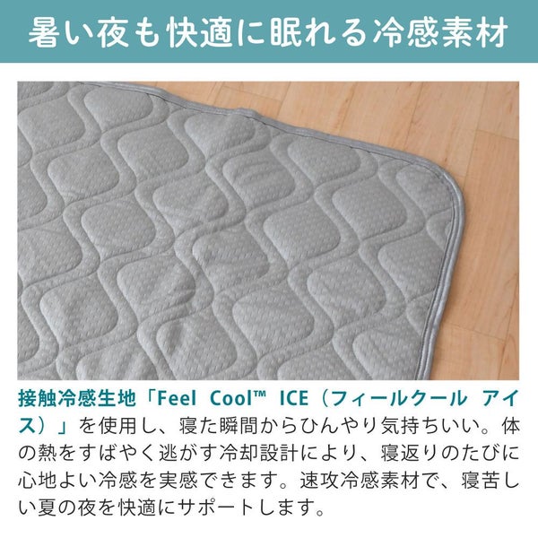 接触冷感生地「Feel Cool ICE(フィールクール アイス)」を使用し、寝た瞬間からひんやり気持ちいい。体の熱をすばやく逃がす冷却設計により、寝返りのたびに心地よい冷感を実感できます。速攻冷感素材で、寝苦しい夏の夜を快適にサポートします。