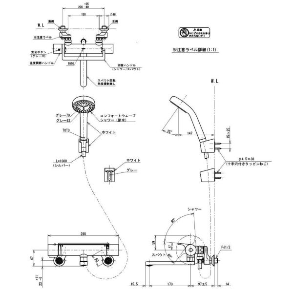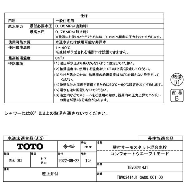 1)TOTO 浴室用 壁付サーモスタット混合水栓(コンフォートウエーブ1モード)TBV03414J1