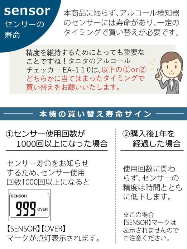 センサー寿命購入後1年経過、またはセンサー使用回数が1000回を超える場合(どちらか早い方)