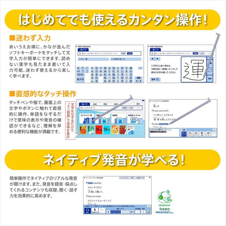 小学生の学習をしっかりサポートできる辞書や百科事典などを収録。読み仮名つきで読みやすい辞書や、イラストやアニメで楽しみながら学べるコンテンツなど小学生の学習レベルに合ったコンテンツが豊富でお子様の学習意欲を育てます。