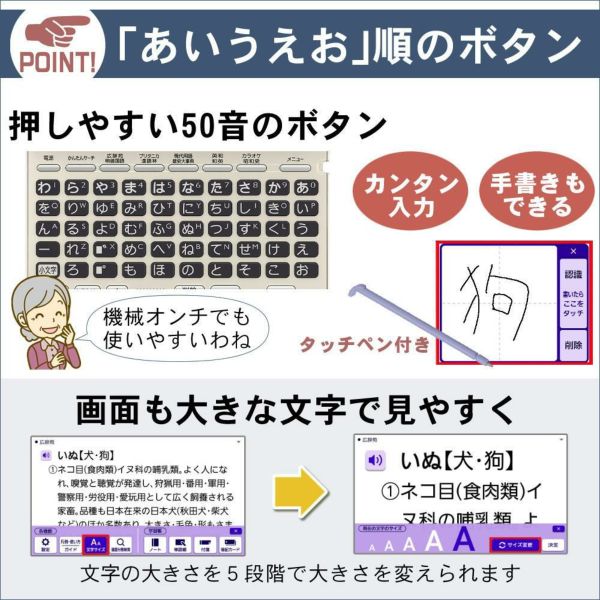 漢字 ことわざ 俳句 の 季語 など、日本語 について調べたいことはよくあります。 英会話 ( 英語 )を学んで、海外旅行 を楽しんだり、健康 について調べて、体調管理 や 病院 でのお医者様からの話の理解に役立てたり。 手紙 や スピーチ の 文例 を探したり、クロスワード で ゲーム を楽しみながら 脳活 したり。 いろんな楽しみが見つかって、教養 が深まって、人生を豊かにしてくれる、使い方 カンタン な 辞書 です。初心者 や シニア世代 の方にも使いやすいので 人気 です。