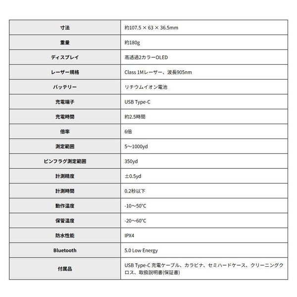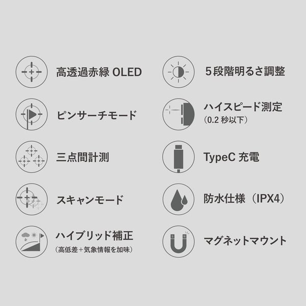 赤と緑の2色OLEDディスプレイを搭載し、視認性とデザイン性を両立。ピンサーチ、スキャンモード、3点間計測に加え、気象情報を加味したハイブリッド計測機能採用。マグネットマウントにより、カートやバッグへの装着もスムーズで、快適な操作性を実現しました。