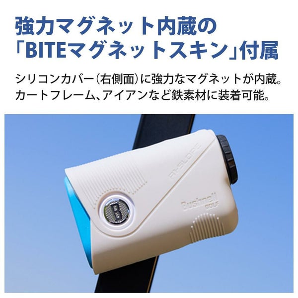 シリコンカバー(装着時、本体右側面)に強力なマグネット(磁石)が内蔵。カートフレーム、アイアンなど鉄素材に装着可能。