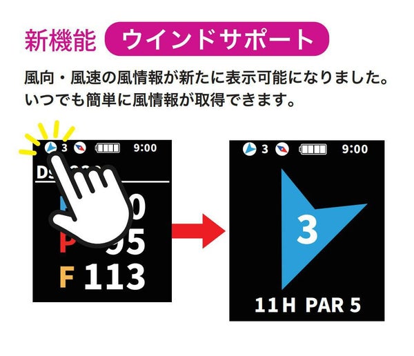 スマホアプリ「EV PRO」との連携で、当日の風向・風速を表示します。ゴルフにとって重要な風情報を常に意識することで、より戦略的にプレーすることができます。