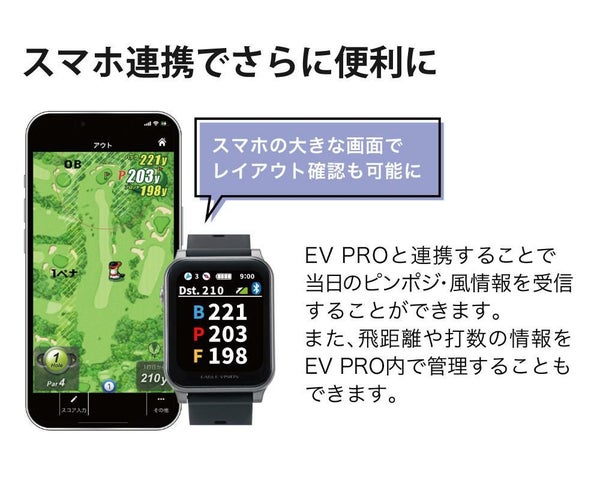 スマホアプリ「EV PRO」との連携で、当日のピンポジ、風情報を自動受信。スマホの大きな画面でレイアウト確認も可能です。また飛距離や打数の情報をアプリ内で管理することもできます。