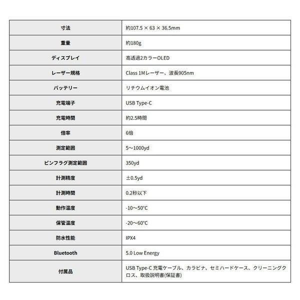 | 付属品 | USB Type-C 充電ケーブル、カラビナ、セミハードケース、クリーニングクロス、取扱説明書(保証書) |