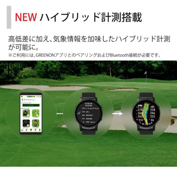 高低差に加え、気象情報を加味したハイブリッド計測が可能に。※ご利用には、GREENONアプリとのペアリングおよびBluetooth接続が必要です。