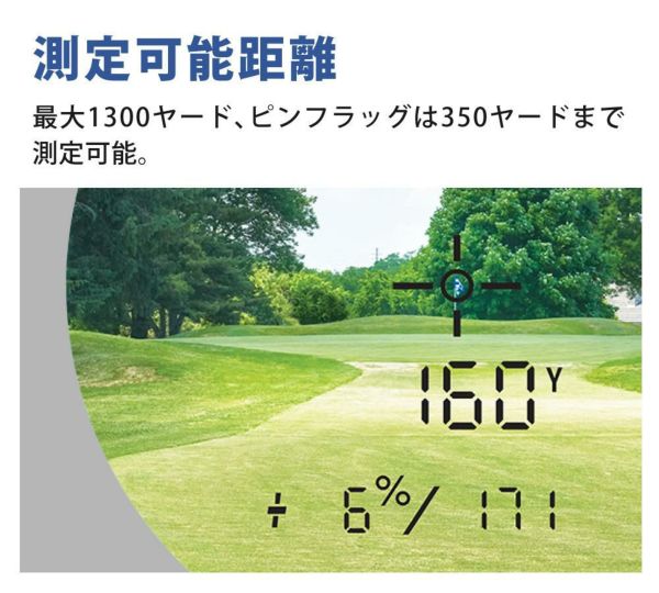 最大1300ヤード、ピンフラッグは350ヤードまで測定可能。