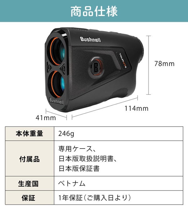 ゴルフ 距離計 レーザー距離計 ピンシーカー ブッシュネル ピンシーカーツアーV7 シフトジョルト は 高精度 測定 を 実現 する ゴルフ用距離計 です。 OLED ハイコントラスト 表示 により 視認性 が 向上 し 赤 緑 表示 で 距離確認 が スムーズ。 ピンフラッグ 測定 最大500ヤード 対応 で 正確 な 測距 が 可能。 ダブルジョルト 振動機能 と レッドリング で 測定完了 を 直感的 に 把握。 スロープ機能 切替 により 競技対応 モデル として 使用可能。 防水 IPX6 仕様 と マグネットマウント で 使いやすさ も 向上。 Bluetooth 対応 アプリ連動 で ゴルフ ナビ 性能 も 強化 された 高機能 距離測定器 です。