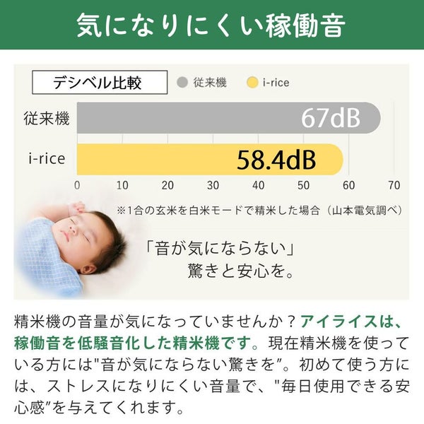 精米中の音を軽減し、58.4dBに抑えました。人と人が少し控え目に話しているくらいの稼働音です。従来の山本電気の精米器は67dB程度なので、約12%も騒音値を軽減しています。