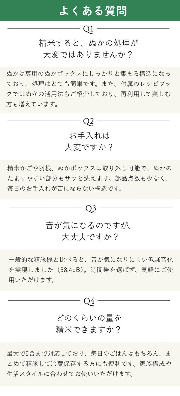 材質素材本体:ABS/ふた:ABS/ぬかボックス:PP/パッキン:シリコン/精米かご:SUS/精米はね:SUS、PP