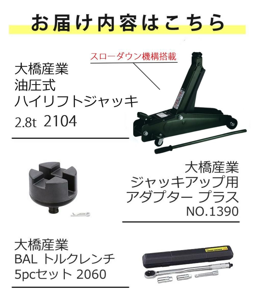 他の画像を見る タイヤ交換 メンテナンスに 通常別売り ジャッキアップ用 アダプタ がセットに より安全に安心して使えるセットになっています トルクレンチもついてお得です 大橋産業 油圧式 ハイリフトジャッキ 2.8t 2104 ジャッキアップ用アダプター トルクレンチ付き 3点セット 販売価格 ¥ 17,570 税込 カートに入れる お気に入りに登録する (0件)