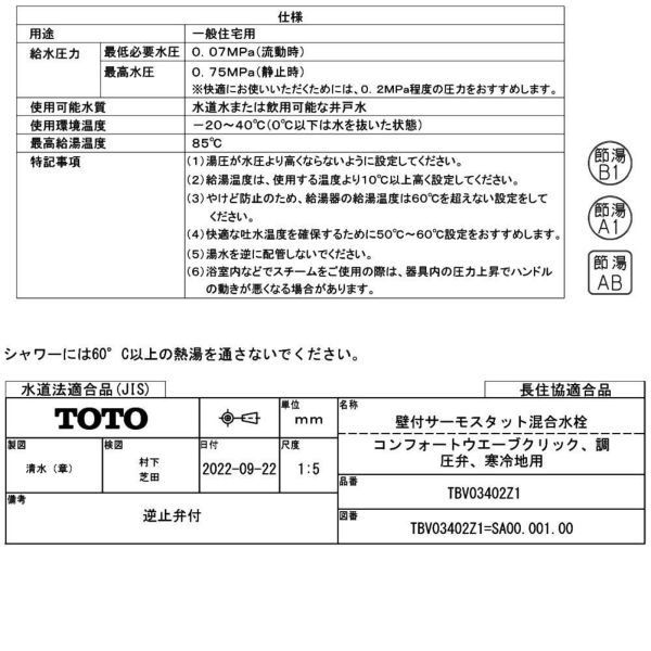 TOTO 壁付サーモスタット混合水栓(コンフォートウエーブクリック、調圧弁、寒冷地用) TBV03402Z1(ラッピング不可)