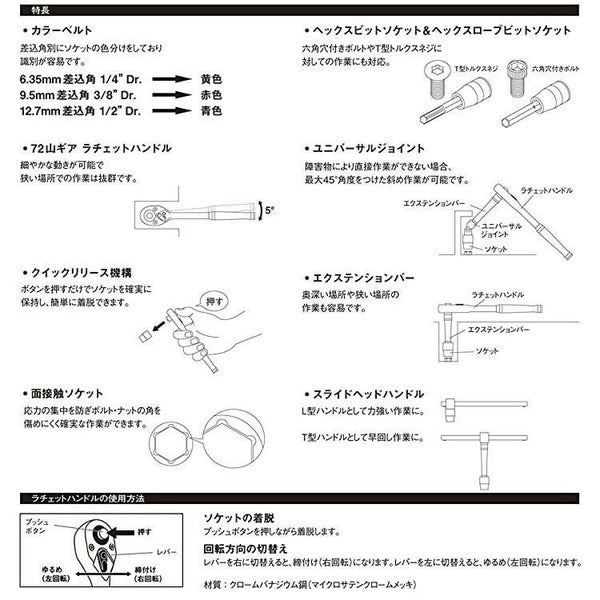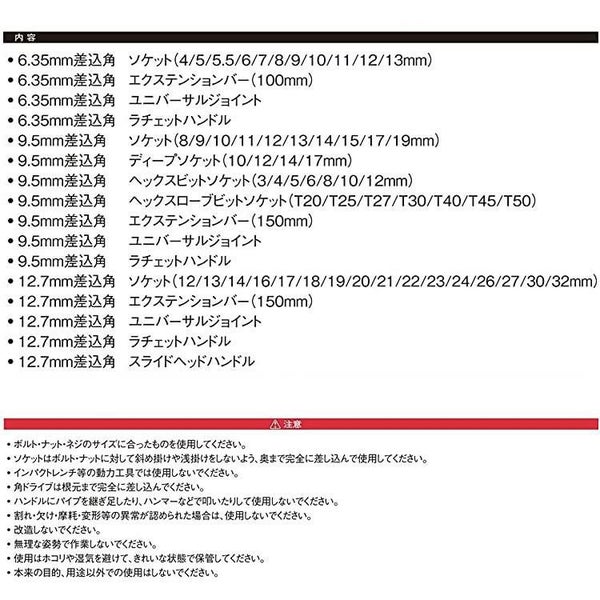 ●セット内容:12.7mm差込角(ソケット(12・13・14・16・17・18・19・20・21・22・23・24・26・27・30・32mm、エクステンションバー150mm、ユニバーサルジョイント、ラチェットハンドル、スライドヘッドハンドル。