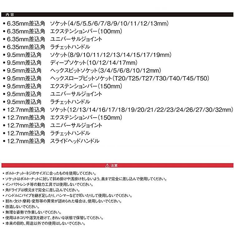 6.3mm、9.5mm、12.7mm差込角のハンドル、ソケットを65点をセットした本格的なソケットレンチセットです。