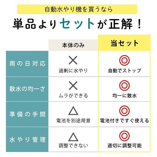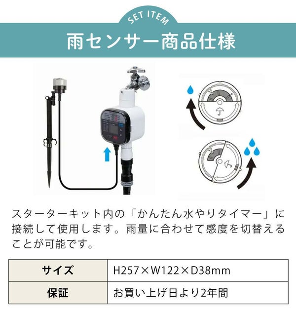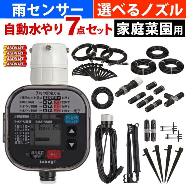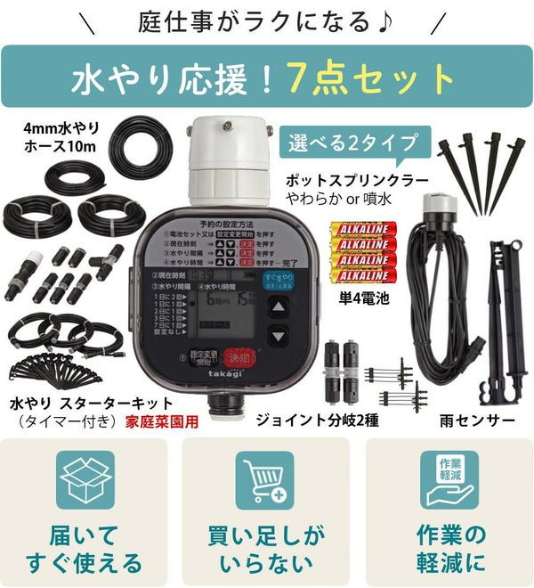この 自動水やりシステム セットは、タイマー式 の 水やりスターターキット に加え、 雨センサー や 選べる ポットスプリンクラー(やわらか/噴水) などを同梱します。水分管理が安定し、野菜などが元気に育ちます。 留守中 や 旅行時 にも便利で活躍する 7点セット です。