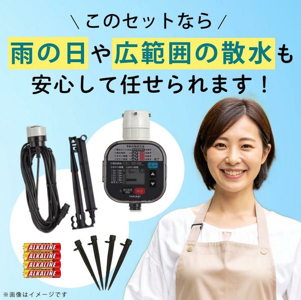 蛇口に取り付けて時間設定など簡単な操作をするだけで自動で水やりできるタイマーと、花壇や家庭菜園などに最適なアイテムを揃えたスターターキット。タイマーは乾電池式のためコンセントがなくても使用可能です