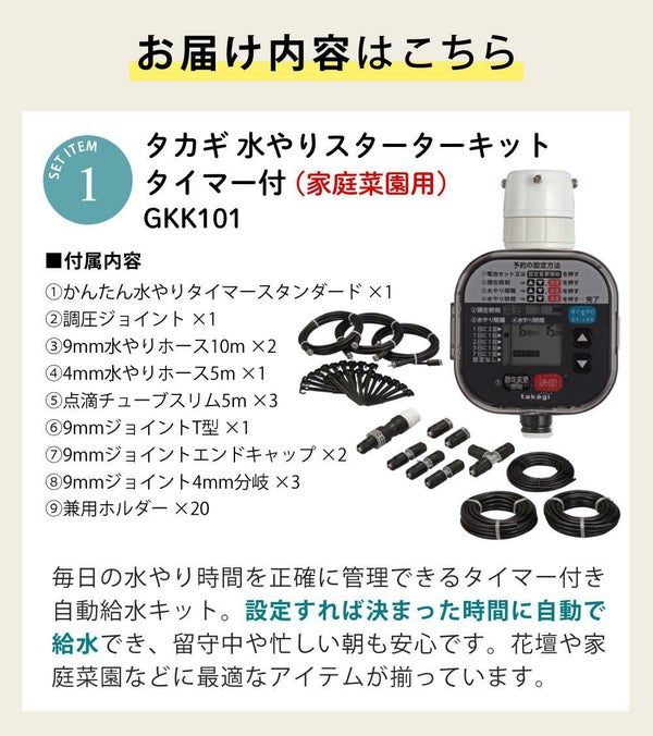 かんたん水やりタイマースタンダード×1 調圧ジョイント×1 9mm水やりホース10m×2 4mm水やりホース5m×1 点滴チューブスリム5m×3 9mmジョイントT型×1 9mmジョイントエンドキャップ×2 9mmジョイント4mm分岐×3 兼用ホルダー×20 |