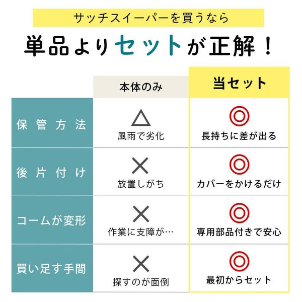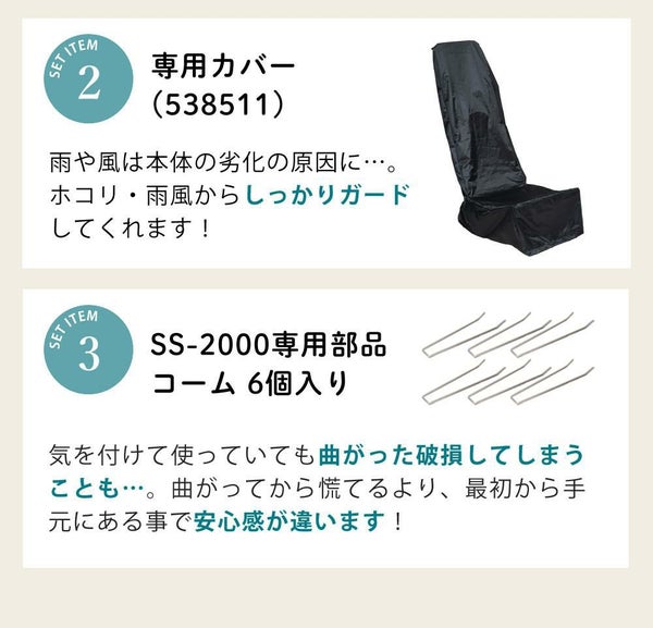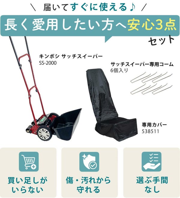 芝生のサッチ(枯れ草)をしっかり集める「サッチスイーパーSS-2000」に、雨風やホコリから本体を守る「専用カバー」、さらに万が一の破損時にも安心な「交換用コーム6本入り」をまとめた安心セットです。