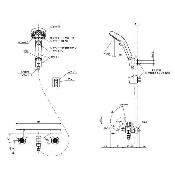 1)TOTO 浴室用 壁付サーモスタット混合栓 70mmコンフォートウェーブクリック90φ TBV03446J1