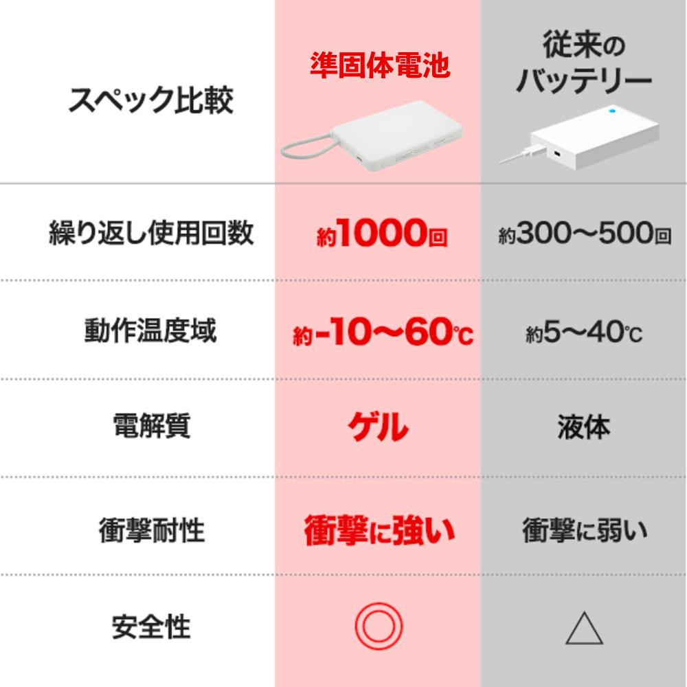 他の画像を見る モバイルバッテリー 5000mAh 発火・爆発リスク 低減 準固体電池 安全設計 ケーブル一体型 1000回充放電 長寿命 2倍長持ち PSE適合 衝撃に強い ゲルポリマー スマホ充電器 防災 type-c 準固体電池 モバイルバッテリー 5000mAh 販売価格 ¥ 4,800 税込 カートに入れる お気に入りに登録する (0件)