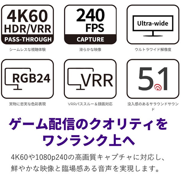 4K60や1080p240の高画質キャプチャに対応し、鮮やかな映像と臨場感ある音声を実現します。