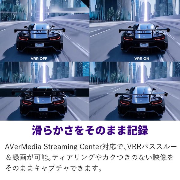 AVerMedia Streaming Center対応で、VRRパススルー&録画が可能。ティアリングやカクつきのない映像をそのままキャプチャできます。