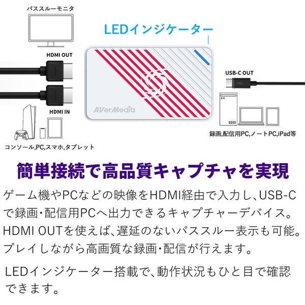 ゲーム機やPCなどの映像をHDMI経由で入力し、USB-Cで録画・配信用PCへ出力できるキャプチャーデバイス。HDMI OUTを使えば、遅延のないパススルー表示も可能。プレイしながら高画質な録画・配信が行えます。