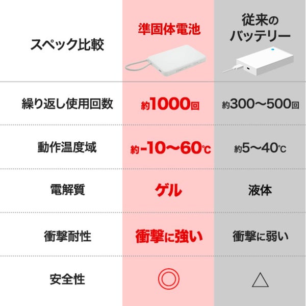 従来のリチウムイオンモバイルバッテリーは電解質が液体の為、落下等の外部からの衝撃、過充放電、使用環境等によってセパレーター(絶縁体)が損傷、正極・負極の電解質が液漏れ・接触してショートし、発火や爆発を起こすリスクがありました。本製品はゲル状電解質を用いた固体電池(半固体電池)を採用!正極・負極の接触・発火リスクを大幅に低減し、安全性を飛躍的に向上させたモバイルバッテリーです!