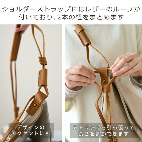 キャンバス生地と牛革の組み合わせがおしゃれなショルダーバッグ。