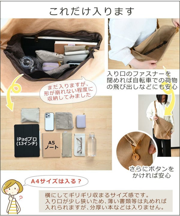 ※A4サイズは、薄い書類(クリアファイル)等でしたら、少し丸めて入れることができますが、分厚い本などは入口のファスナー部が少し狭くなっているため入りません |