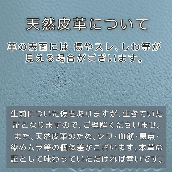 皮革商品は、革の個体差により、素材感や色味に、若干の誤差がある場合がございます。また革表面にシワ(血筋)や生前についた傷、シボ、色ムラ、黒点などが見られることがございますが、革の生きた証ともなりますので、ご理解ください。