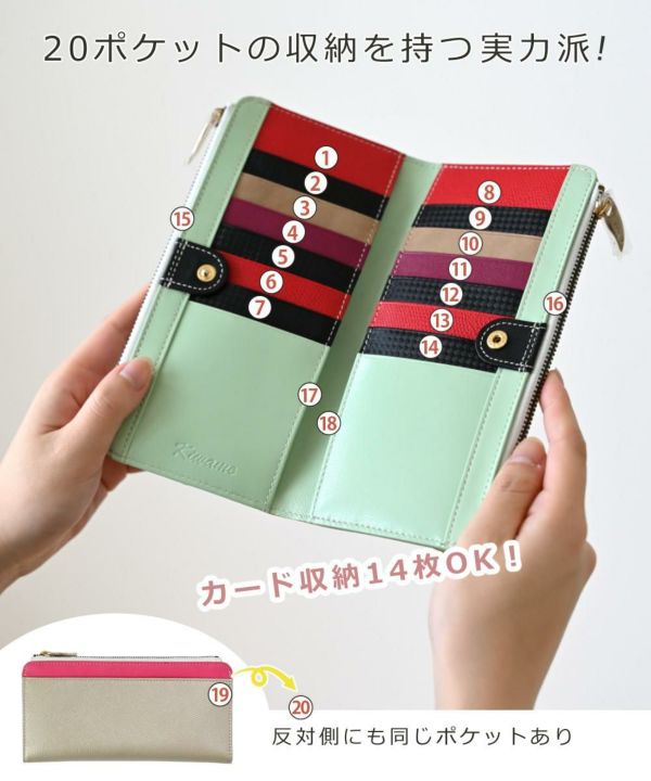 厚さ約2cmとコンパクトながらも、14個のカード入れを含めて、全ポケットは全部で20個という