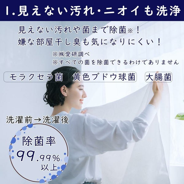 黄色ブドウ球菌・大腸菌・モラクセラ菌の洗濯実験で除菌率99.99%以上を実証済。